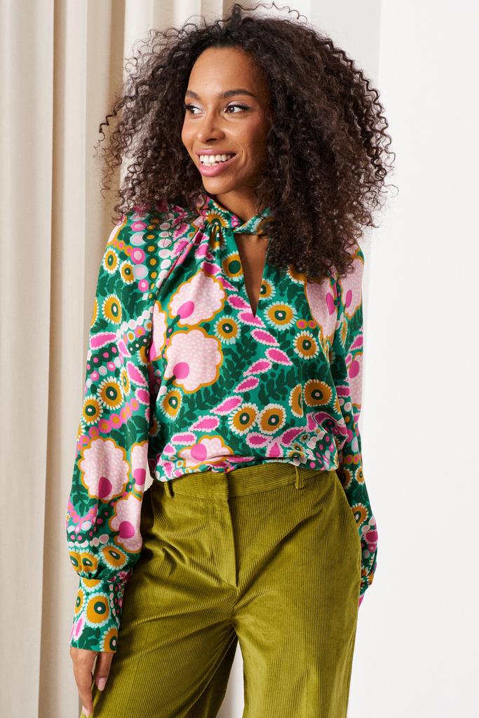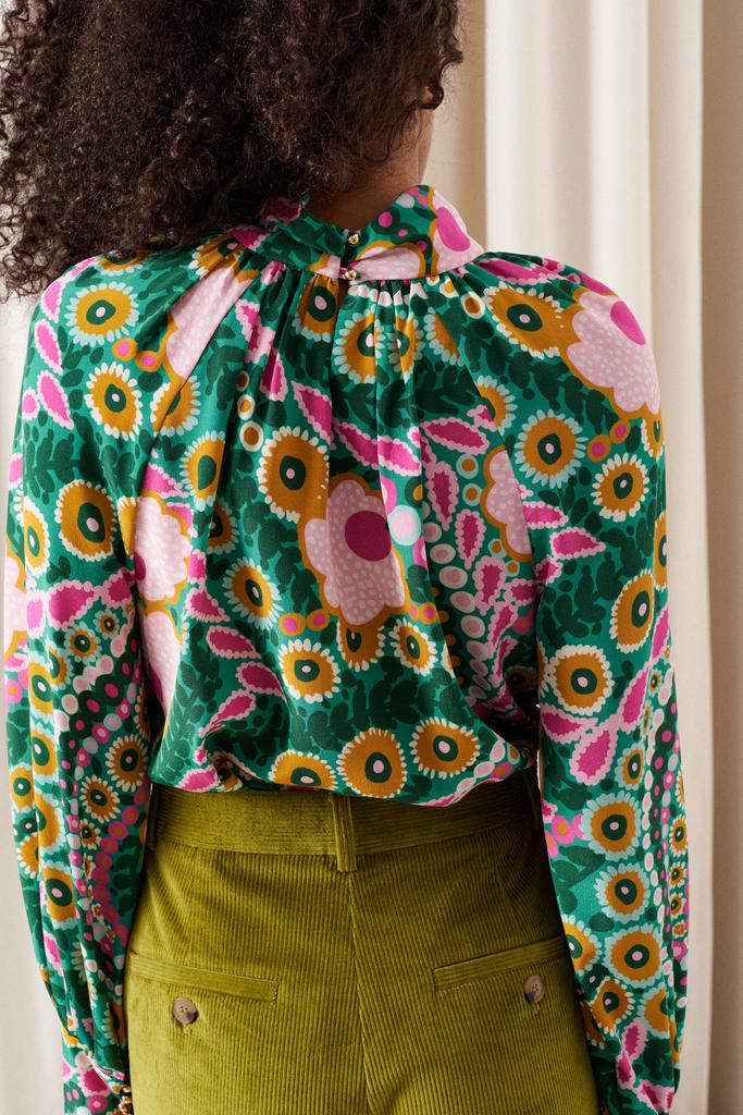 Блузка прямого силуэта, длиной 65см. Рукав реглан, длиной 74см от горловины. Низ рукава обработан манжетой с навесными петлями. Воротник-стойка, застегивается на пуговицы по спинке. Состав: 100% шелк