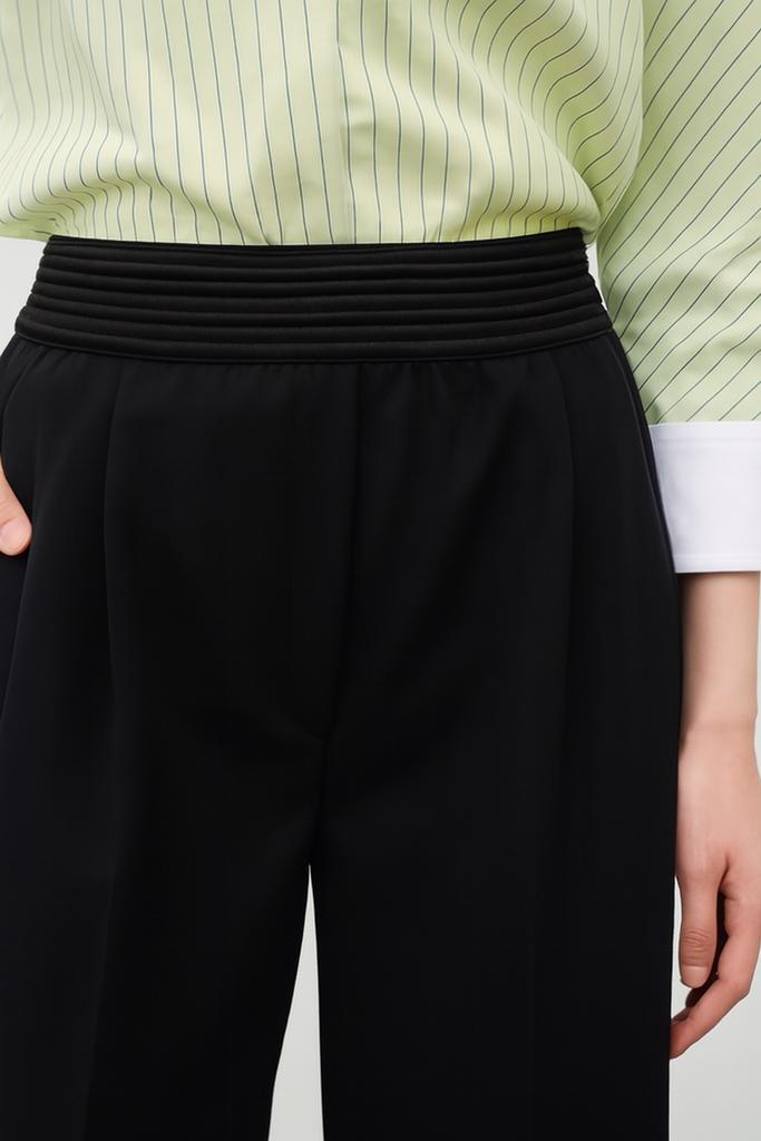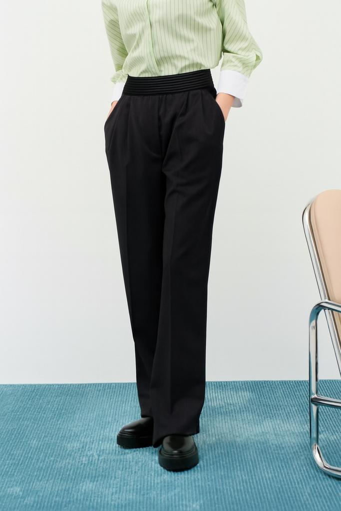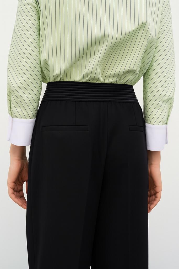 Брюки длиной по боковому шву 104 см (от шва притачивания пояса), по шаговому шву 83 см. Ширина брюк по низу 25 см. Передние половинки брюк с односторонними складками и наклонными карманами. Декоративный эластичный пояс. Имитация карманов с листочками по заднему полотнищу брюк. Имитация застежки-гульфик.