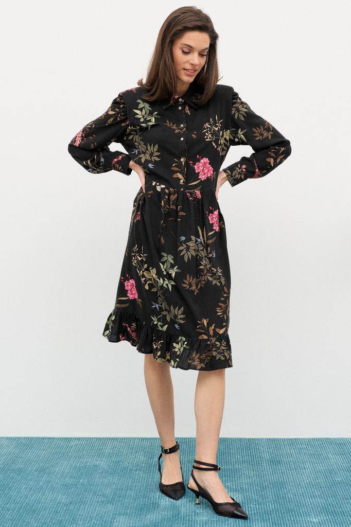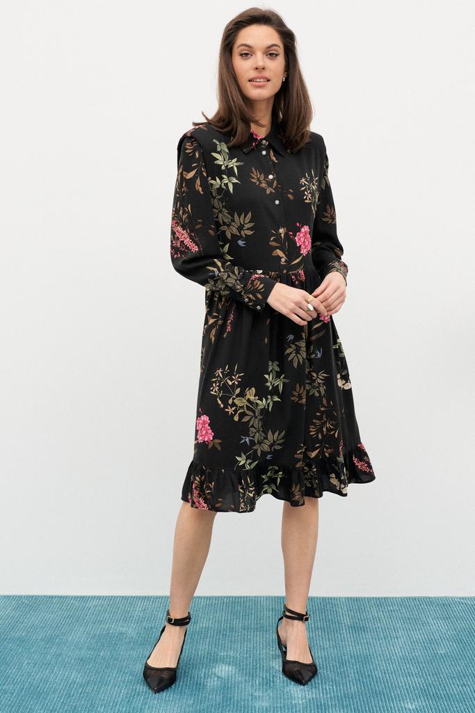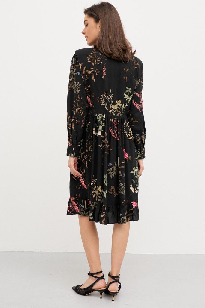 • Платье отрезное по линии талии, юбка со сборкой по талии и узкой оборкой по низу