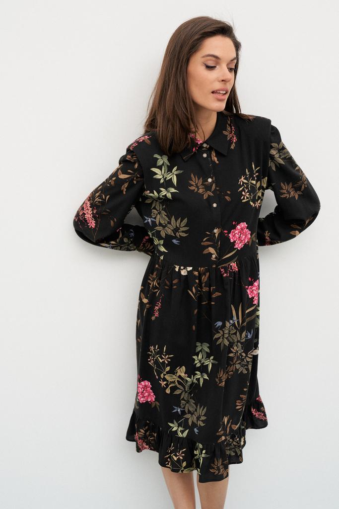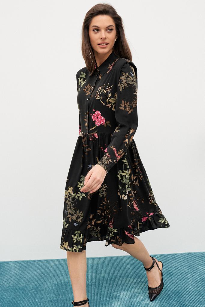 • Платье отрезное по линии талии, юбка со сборкой по талии и узкой оборкой по низу