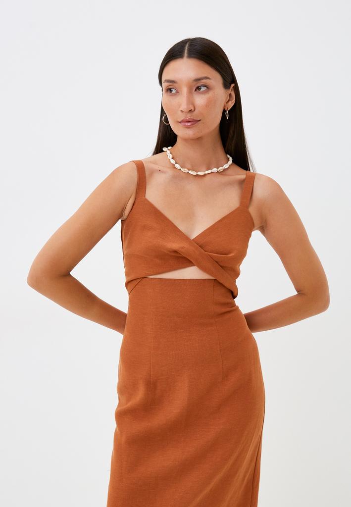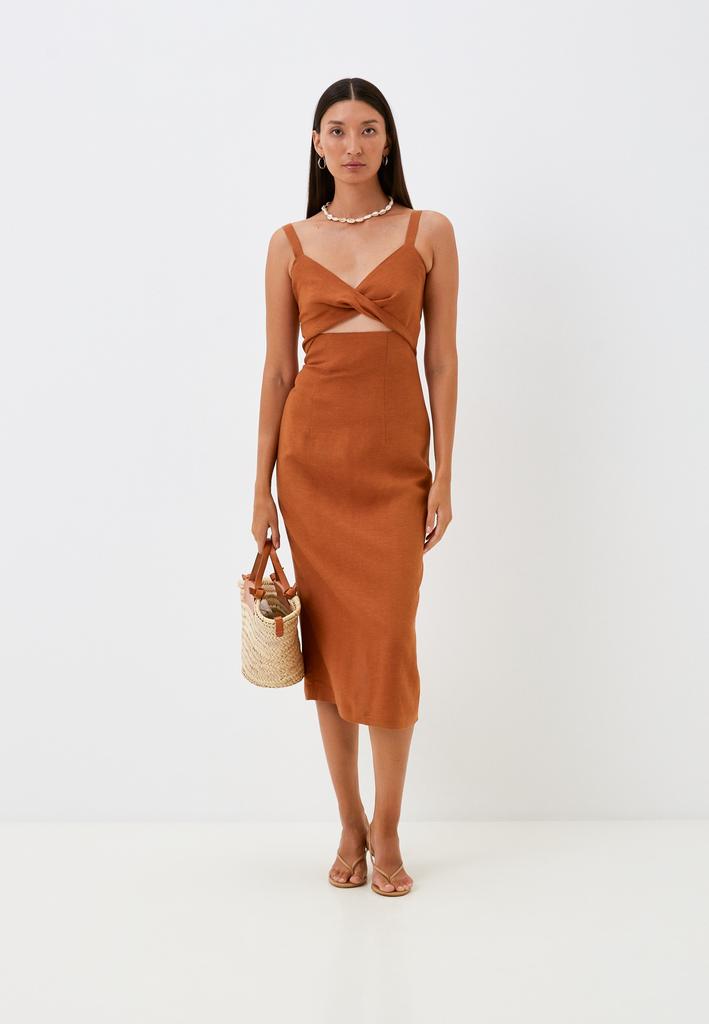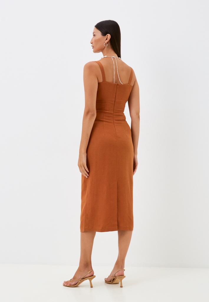 • Женское платье отрезное по линии талии из смесового льна на бретелях, длиной 98 см