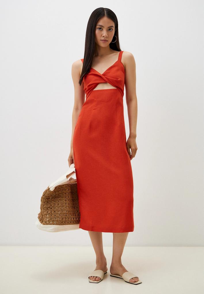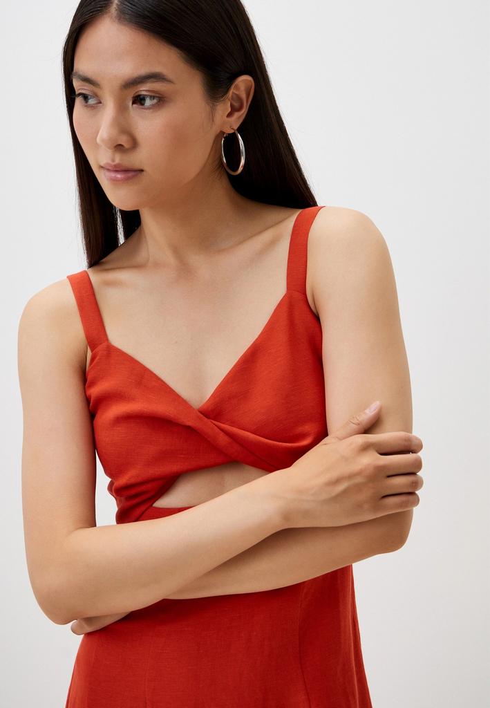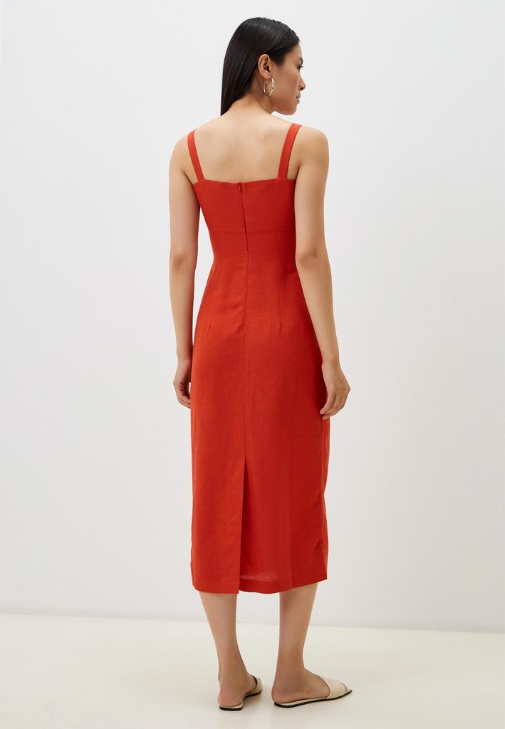 Женское платье отрезное по линии талии из смесового льна на бретелях. Верх переда двойной с перекрутом. Юбка-карандаш со шлицей сзади. По спинке застежка на потайную тесьму-молнию