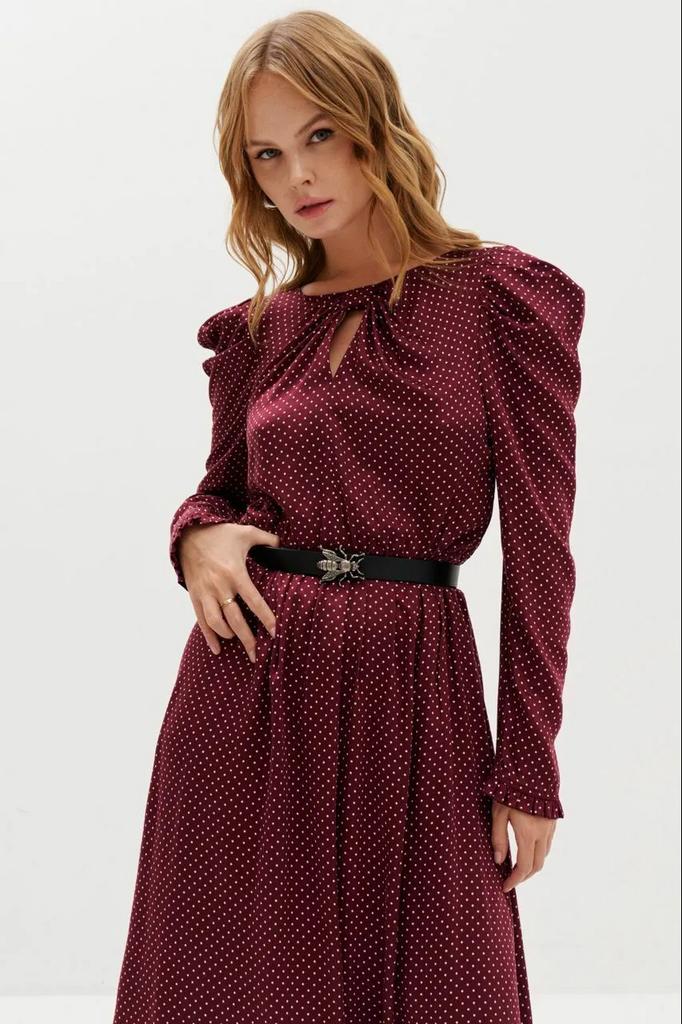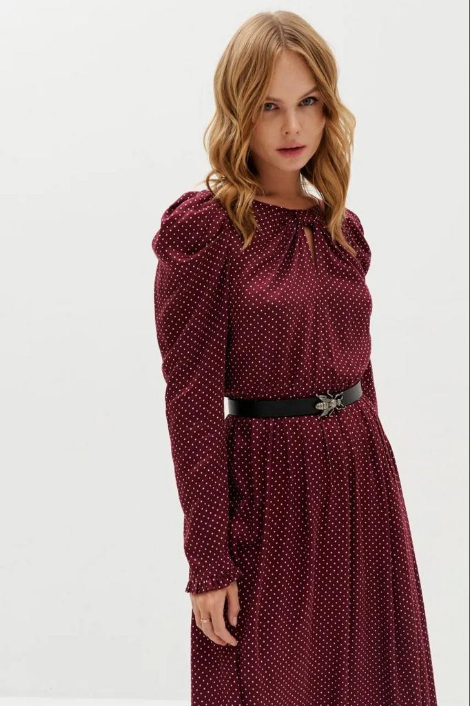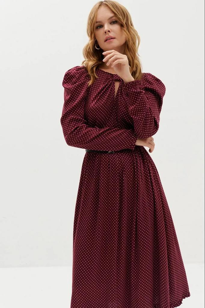 • Платье-миди отрезное по талии длиной 113,0 см, с объемными рукавами по окатам длиной 65,0 см.