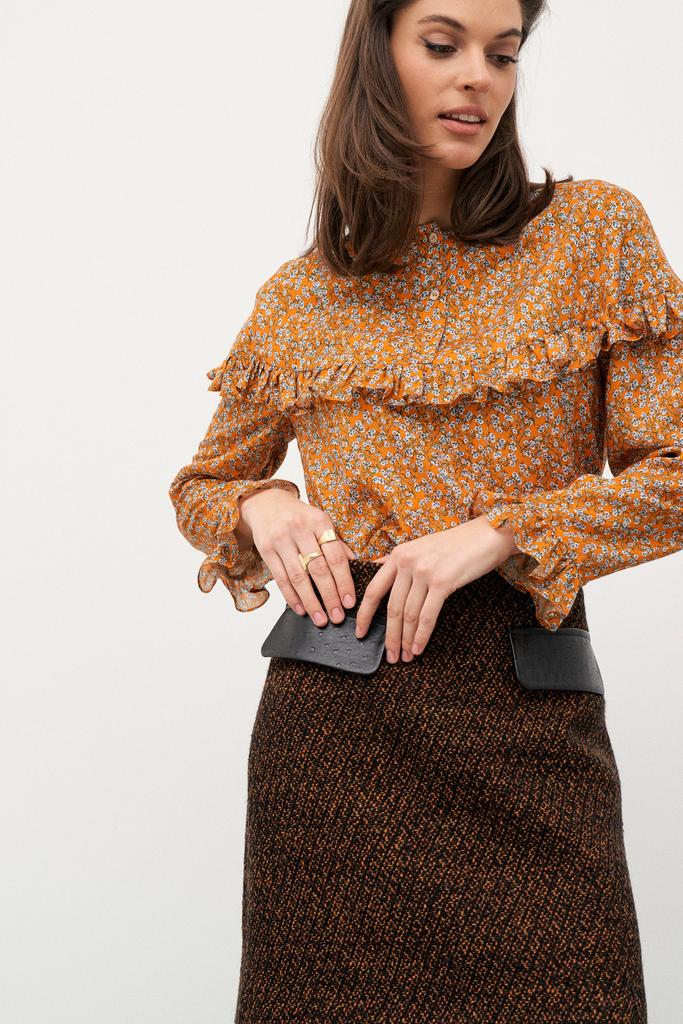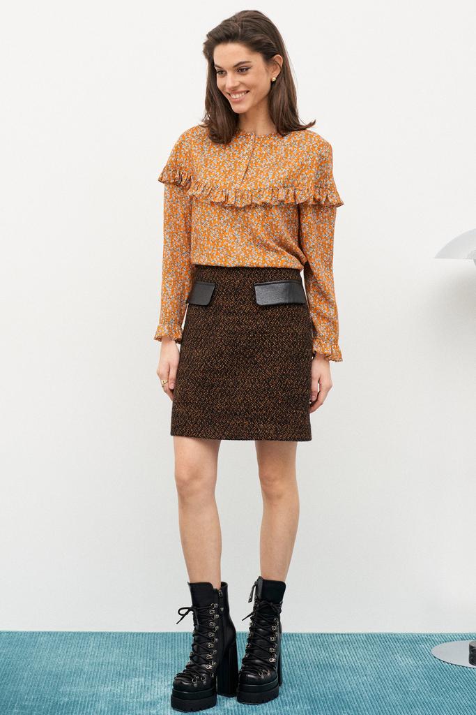 Мини-юбка силуэта трапеция из итальянской буклированной ткани длиной 45,0 см по боковому шву. По переду настрочные клапаны из экокожи. Застежка в среднем шве заднего полотнища на потайную тесьму-молнию. Юбка продублирована качественным клеевым материалом на подкладке.